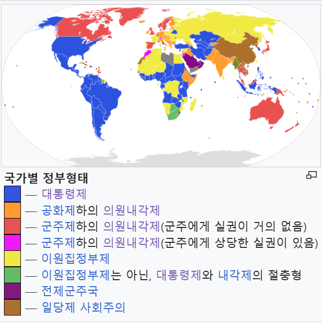 위키백과(2023.12.20 방문기준: 정부형태 - 위키백과, 우리 모두의 백과사전 (wikipedia.org) )는 전세계 정부형태를 크게 대통령제,  의원내각제, 이원집정부제, (이원집정부제가 아닌)대통령제와 의원내각제의 절충형. 전제군주제, 일당제 등으로 구분하고 있다.